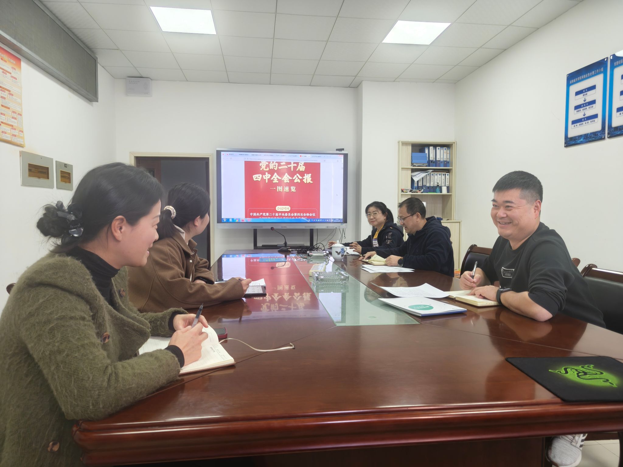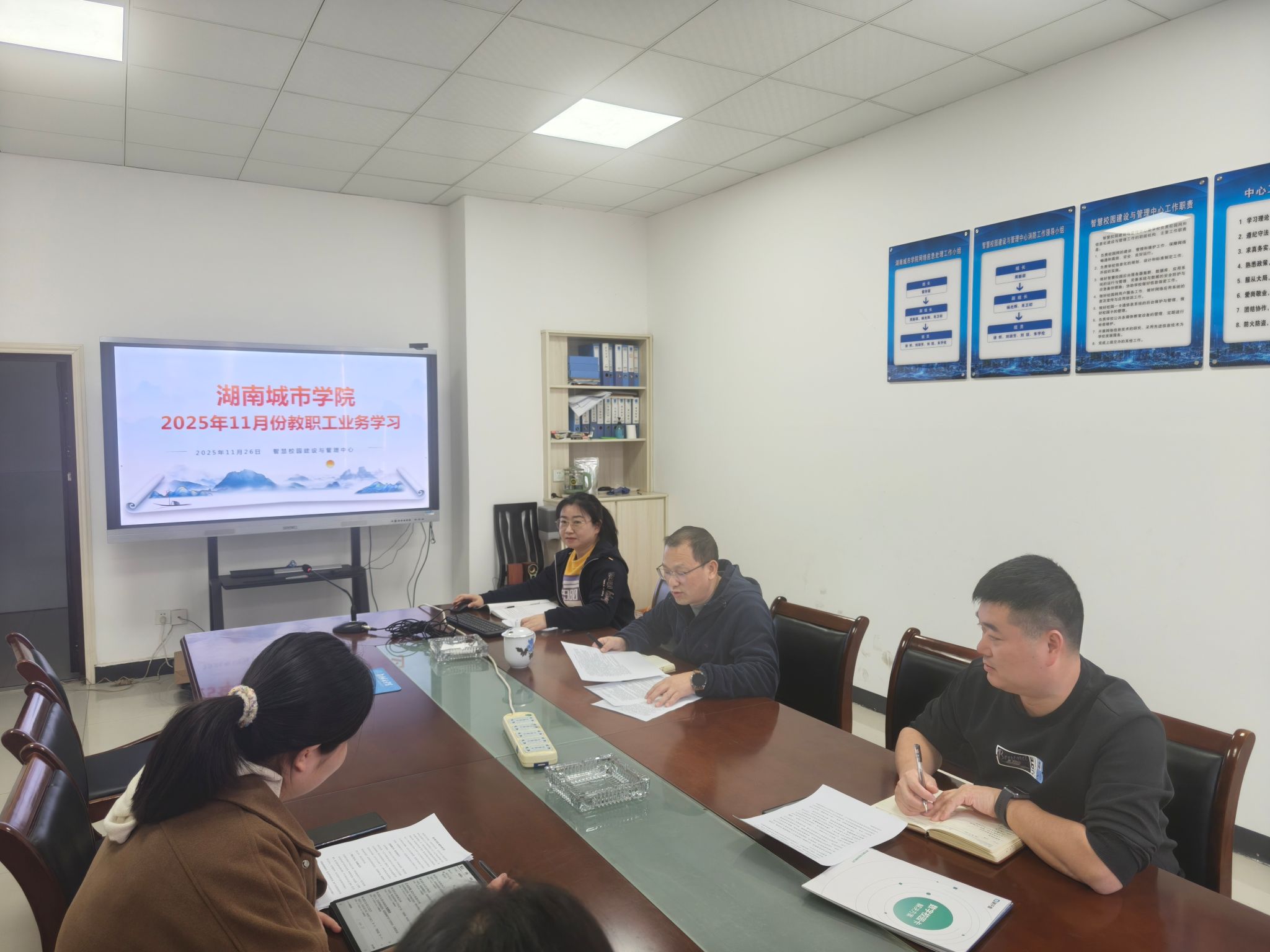 本网讯(通讯员 刘琰)2025年11月26日,智慧校园建设与管理中心党支部在一工训楼313支部会议室组织召开以“学习贯彻党的二十届四中全会精神,奋力推进智慧校园高质量发展”为主题的教职工业务学习会。会议由党支部书记周新邵主持,中心全体教职工党员参加。本次学习聚焦国家战略部署与教育信息化发展实际,深入学习党的二十届四中全会公报、《中共中央关于制定国民经济和社会发展第十五个五年规划的建议》以及《习近平谈治国理政》第五卷相关重要论述,进一步统一思想、凝聚共识,明确方向、强化担当,为高质量推进智慧校园建设注入强劲动力。