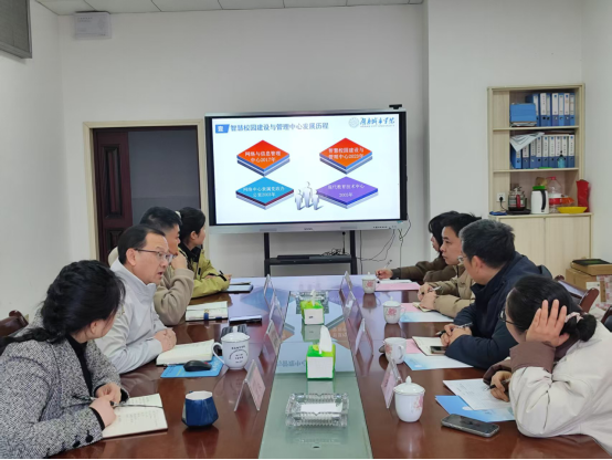 何宏对我校在智慧校园建设中展现的系统思维、务实举措及实践成效给予高度评价。他表示,当前湖南工程学院正处于信息化建设提质升级的关键阶段,此次调研旨在借鉴我校先进经验与成熟做法,为该校智慧校园建设注入新思路、新方法,推动本校信息化建设迈上新台阶。随后,双方围绕技术架构整合、数据治理路径优化、校企协同模式创新、“一卡通”数据治理等重点内容展开深入交流。